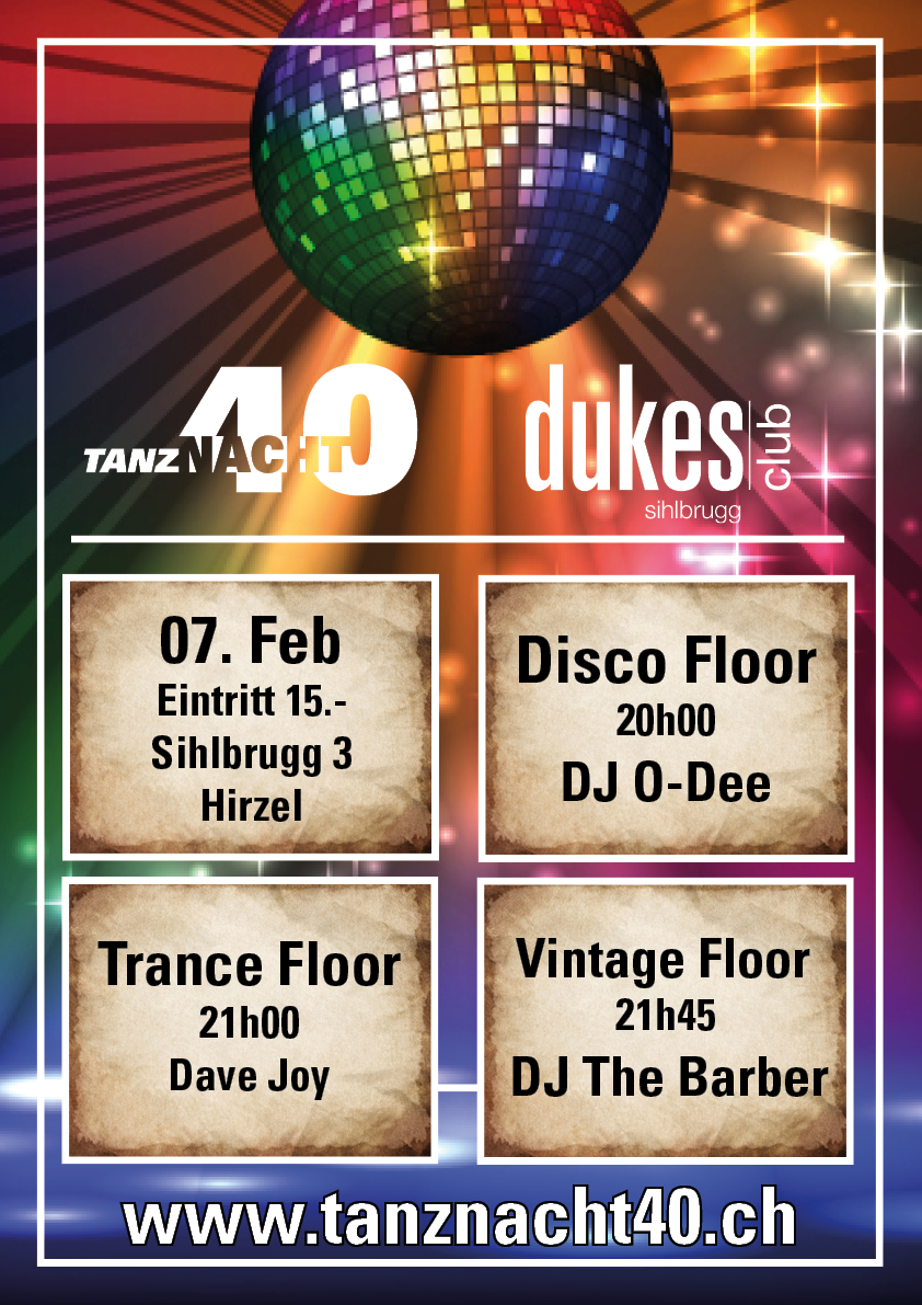 Home Events TANZNACHT 40 auf 3 Floors TANZNACHT 40 auf 3 Floors + Zu Google Kalender hinzufügen + iCal / Outlook export Datum 07. Feb.. 2026 Vorbei! Uhrzeit 20:00 - 02:00 Kategorie Eventsaal Saloon Sihl 3 / Club