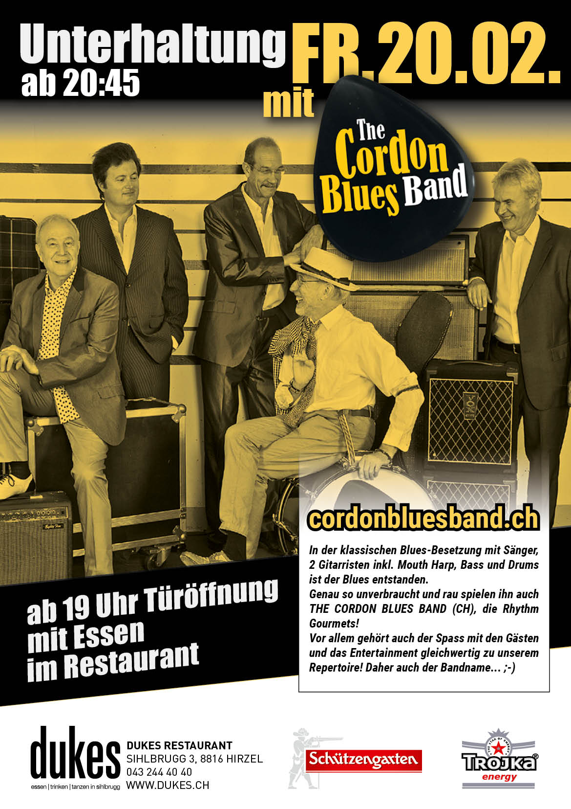 Home Events The Cordon Blues Band ab 20.45 The Cordon Blues Band ab 20.45 + Zu Google Kalender hinzufügen + iCal / Outlook export Datum 20. Feb.. 2026 Uhrzeit 19:00 - 23:55 Kategorie Eventsaal